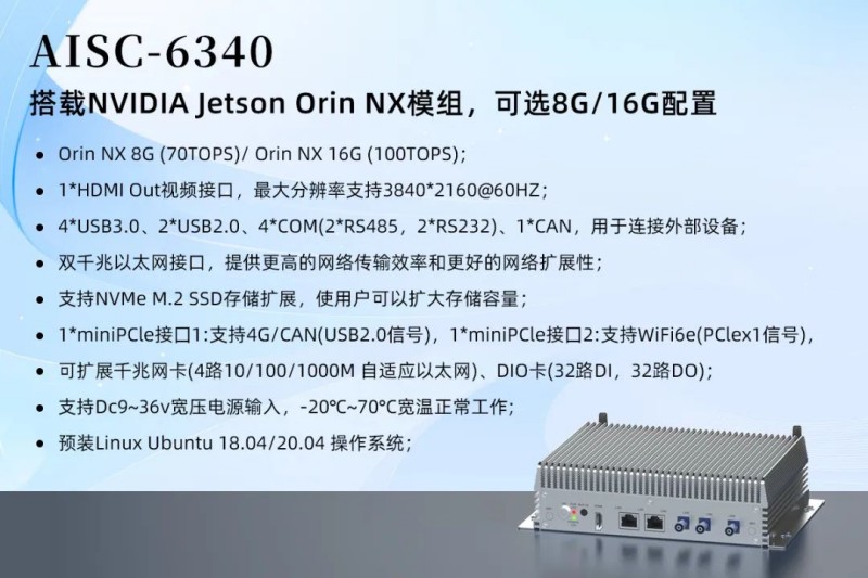 搭載NVIDIA® Jetson Orin™ NX模組,集成了8核ARMv8.2 64位CPU和NVIDIA Ampere架構GPU,具有強大的計算能力。
