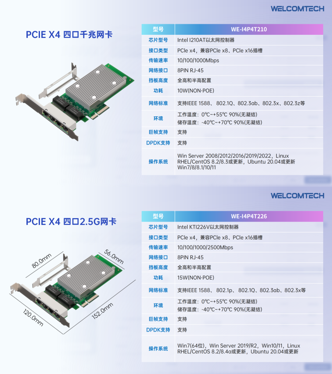 WE-I4P4T226是基于Intel I226芯片方案的基礎(chǔ)上自主研發(fā)的2.5G四口網(wǎng)卡,WE-I4P4T210是基于Intel I210芯片方案的基礎(chǔ)上自主研發(fā)的千兆四口網(wǎng)卡,擁有傳輸高效/穩(wěn)定穩(wěn)定的性能,能夠滿(mǎn)足工業(yè)自動(dòng)化、機(jī)器視覺(jué)和服務(wù)器領(lǐng)域需求更多端口的用戶(hù)較為理想的部署方案。
