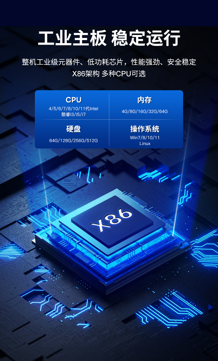 · 擁有豐富的I/O接口,1*LAN(可選配雙網)、4*USB3.0、6*擴展口(可擴展COM、USB等)